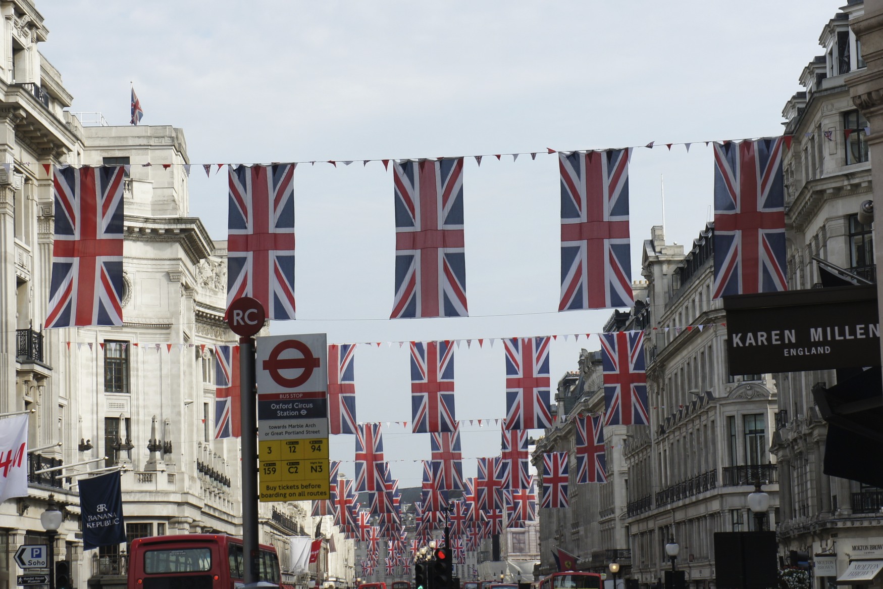 I recently had the good fortune to travel to London for an out-of-home campaign review. The trip took place during the Queen’s Jubilee which was filled with the appropriate pomp and circumstance associated with the Diamond Anniversary of Queen Elizabeth’s reign. Those in London were filled with pride and many showed it in their attire. Two women in particular stood out with their Union Jack patterned coats. Flags truly waved everywhere. The frequency of the Union Jack was prominent. It was a solid reminder of the significance it has culturally in addition to patriotism. Outdoor shows it’s colors in an abundance of unique ways: modern digital varieties, traditional banners or even coats and bags.